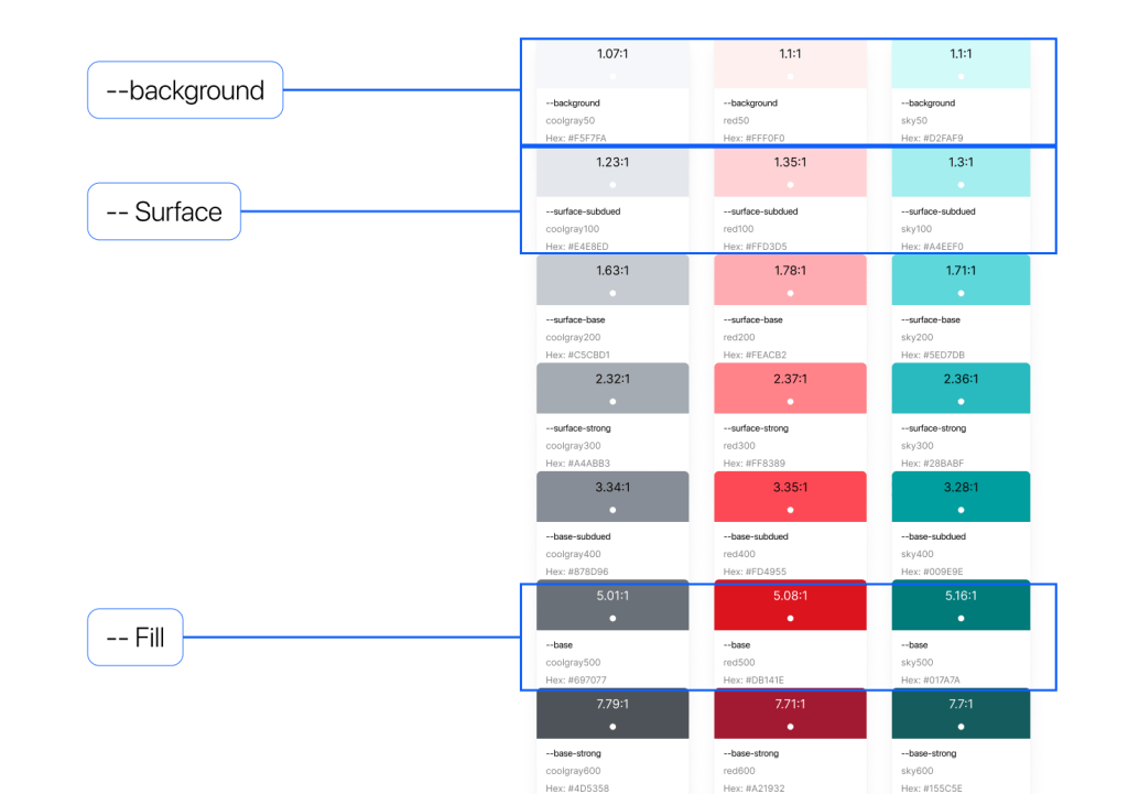 Contrast Optimized Color System allowed me to pick colors from the ramps and assign them roles. For example, across all ramps and all color roles, surface colors- which map to the 50s column- share an almost identical contrast against white. As you can see below, this concept is mastered across the entire palette.