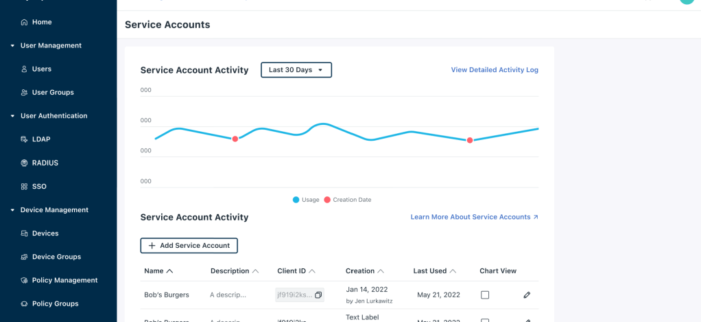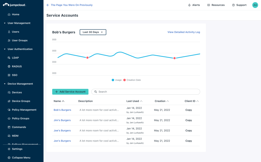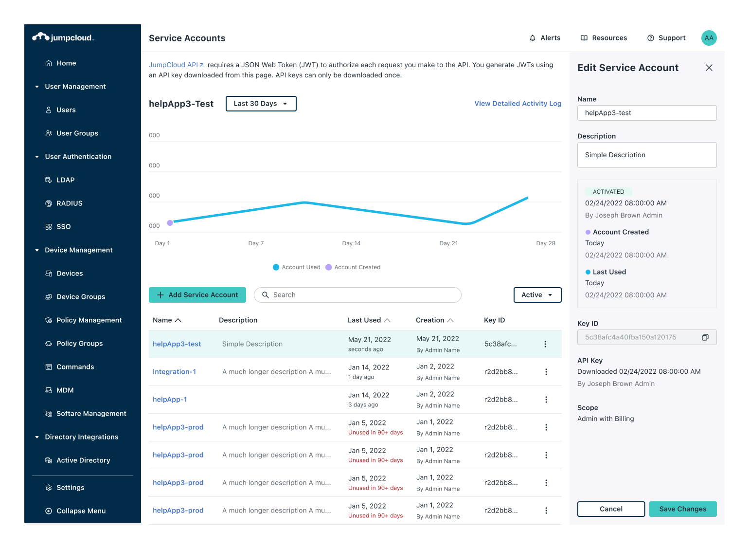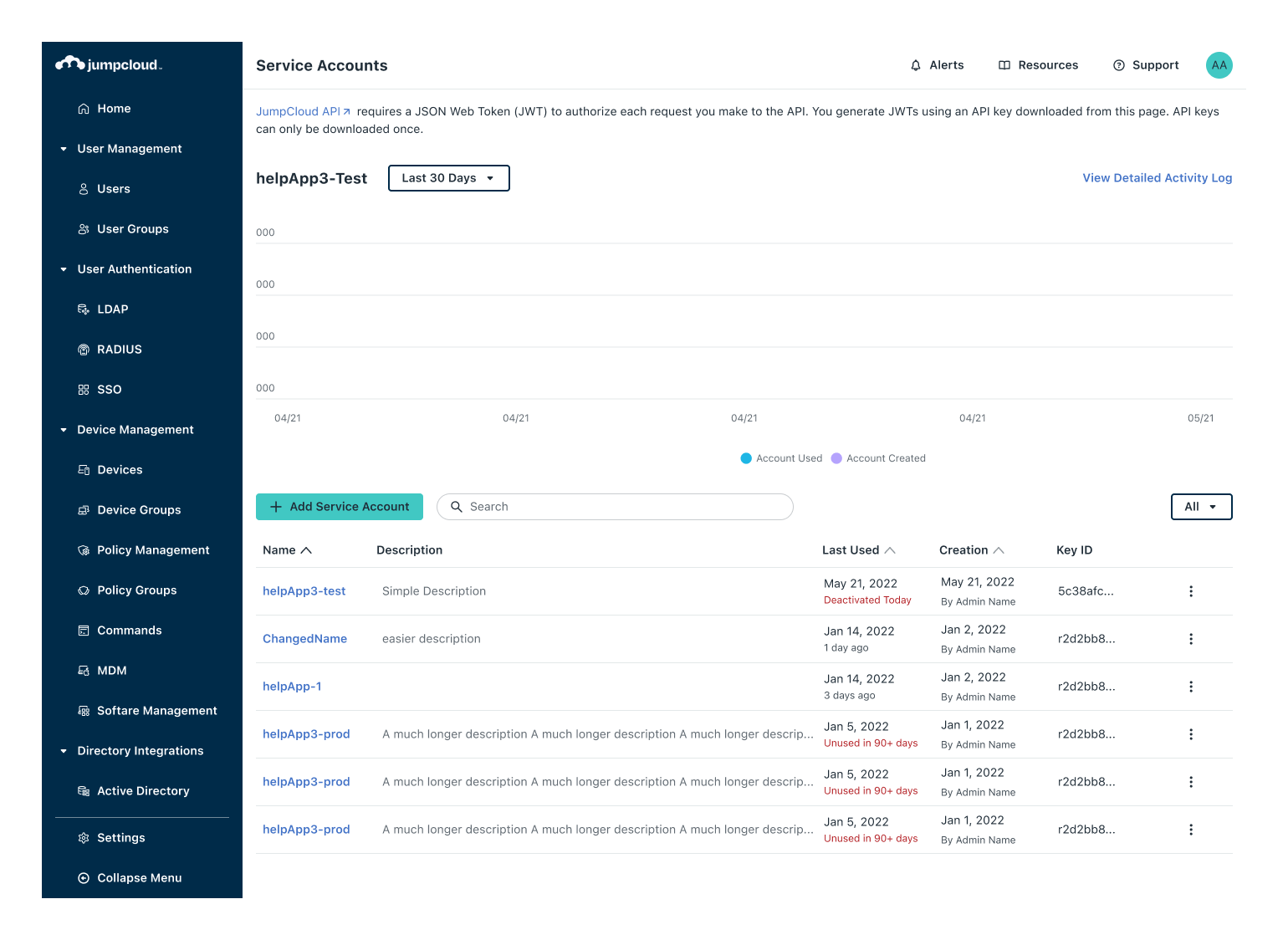 We built Service Accounts for Jumpcloud to improve the usability of API Keys in the Admin Console. This feature allows IT Admins to create, track, and manage API Keys within an organization. API Keys are a critical product mechanic that enable users to interact with core product features.
