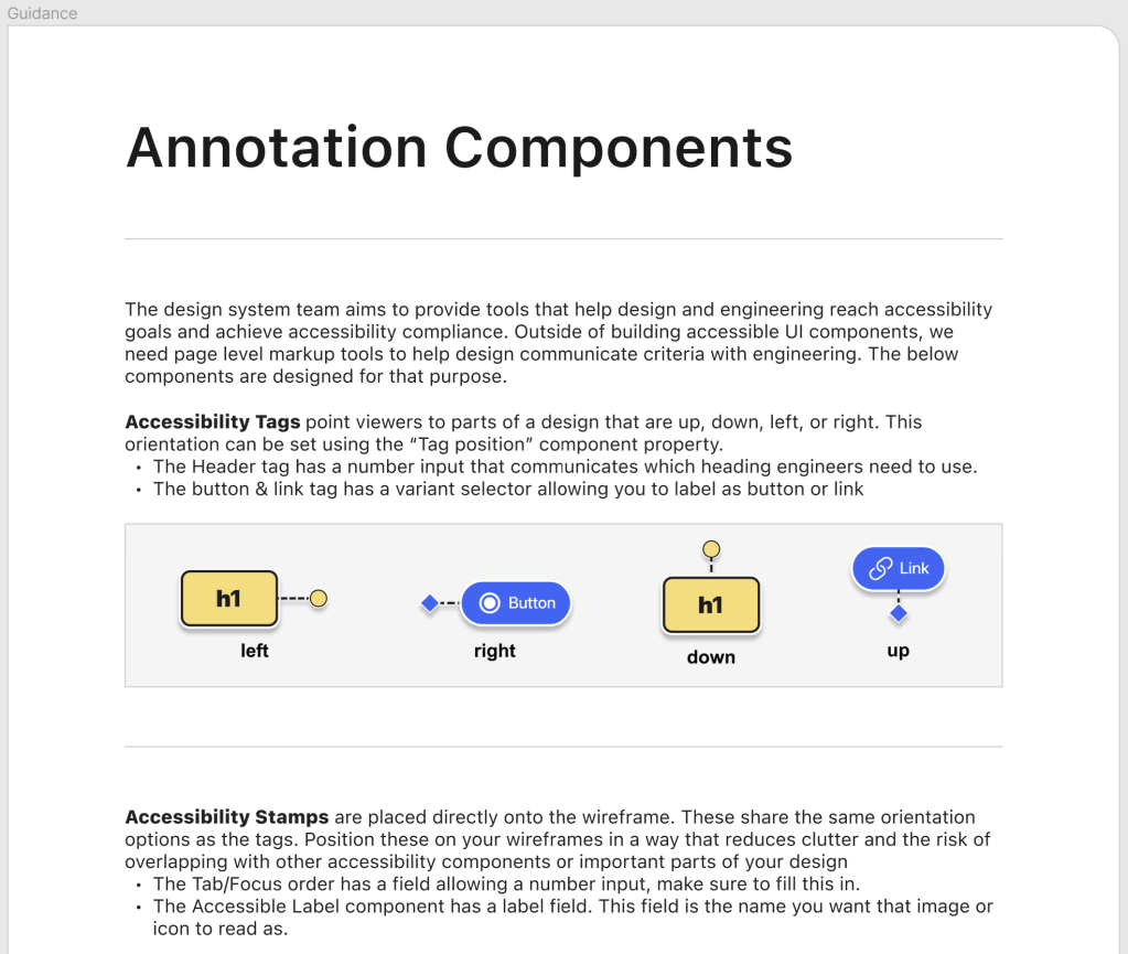 This toolkit provides a structured framework for meeting accessibility compliance. It includes annotation components designed to address key WCAG requirements. These components are designed to align with WCAG’s core principles. Using the annotations and reading the documentation can help designers and engineers recognize how to make web content that is operable, robust, perceivable, and understandable, while also meeting conformance standards. By breaking down compliance requirements into actionable annotations, this toolkit simplifies the process of creating accessible and inclusive designs.