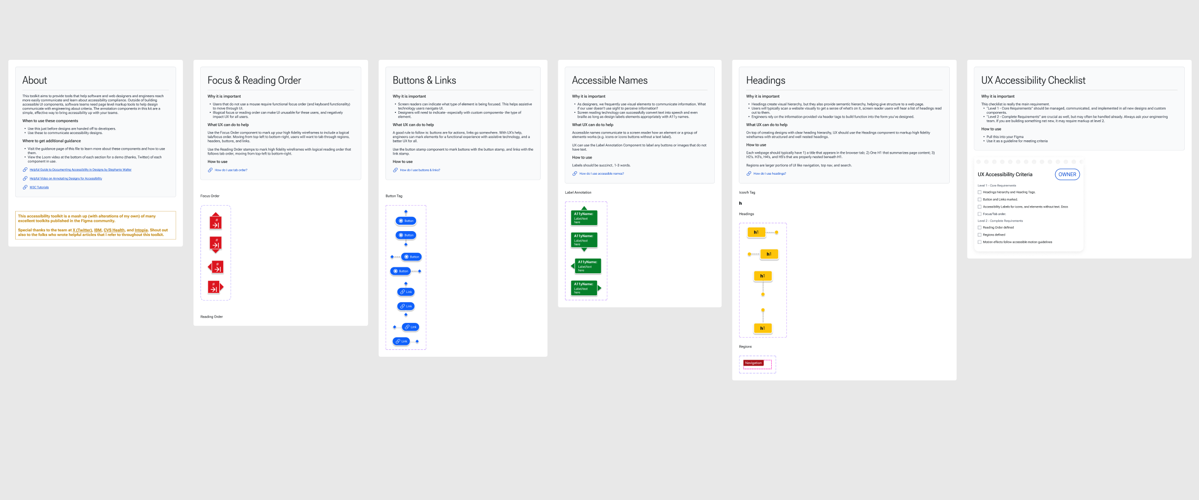 I designed this web accessibility toolkit according to w3.org’s recommendations and documentation, while also leaning into the best Accessibility toolkits I could find on the Figma Creative Commons. In that sense, the toolkit is hopefully a clear, simple, mashup and reference guide of tools to use for anyone within an organization who wants their designs to be WCAG 2.1 compliant.